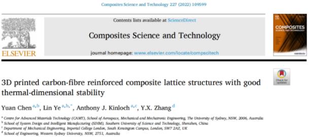 2022年,复合材料TOP期刊《Composites Science and Technology》发表了悉尼大学和南方科技大学在3D打印碳纤维增强复合材料晶格结构方面的研究工作,论文标题为“3D printed carbon-fibre reinforced composite lattice structures with good thermal-dimensional stability”。