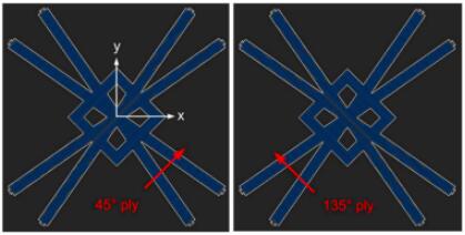 为了研究使用双复合材料方法的任何有益效果,我们也使用3DFFF打印工艺制作了一些平面晶格,但现在对所有不同的组件只使用SCF/PA复合材料,即中心交叉晶格和四个外带组件。对于这种SCF/PA平面晶格,使用[45°/135°]9体系结构沉积了18层SCF/PA复合材料。因此,对于所有使用FFF打印工艺制造的3D打印部件,沉积了18层适当的复合材料,使每个部件的最终厚度名义上为2.25 mm。图2为45°和135°铺层示意图。