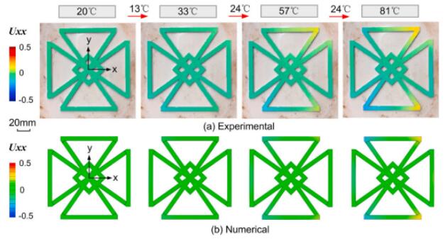 首先,在这两个图中,实验结果和数值模拟结果之间有很好的一致性。这种良好的一致性在图6中得到了最清楚的显示,因为对于这种单独使用SCF/PA复合材料制造的平面晶格,外带组件的热位移Uxx明显更大。
