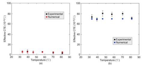 图 7 有效CTE复合平面晶格结构测试温度的实验和数值结果:(a)采用CCF/PA中心交叉晶格组件和4个SCF/PA外带组件,(b)采用SCF/PA中心交叉晶格组件和4个SCF/PA外带组件。