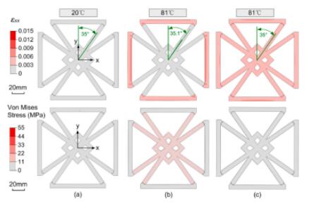 首先,在参考温度为20摄氏度下,没有明显的应变和应力,见图8(a)。如图8(b)所示,在81摄氏度下时,由一个CCF/PA中心交叉晶格组件和四个SCF/PA外带组件组成的平面晶格比单独使用SCF/PA复合材料的平面晶格具有更高的应力,见图8(c)。事实上,这一结果是可以预料的,因为由一个CCF/PA中心交叉晶格组件和四个SCF/PA外带组件组成的双复合平面晶格受到约束,从而产生较小的热位移,从而产生低效的有效CTE。然而,与单独使用SCF/PA复合材料制造平面晶格相比,这导致了中心交叉晶格中的应力积累,从图8(b)和(c)可以看出。