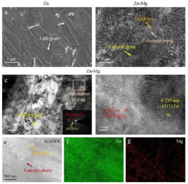 在纯锌支架的显微组织中可以观察到大小为1-10μm的板条状晶粒。相比之下,锌镁支架中则为任意分散的细小的胞晶和柱状亚晶粒(<1μm)和枝晶,LPBF锌镁支架的晶粒尺寸远小于铸造支架(~30μm),晶粒尺寸的细化可归因于镁的晶粒细化能力及LPBF过程中的快速凝固。在HAADF图像中观察到枝晶颗粒和共晶结构(图1e),TEM-EDS图谱分析表明镁元素在共晶相中相对富集,Mg的加入促进了板条粗晶向细晶+柱状晶的转变和Mg2Zn11沉淀的产生。而熔池中的强对流和快速凝固有利于元素的扩散和均匀化。