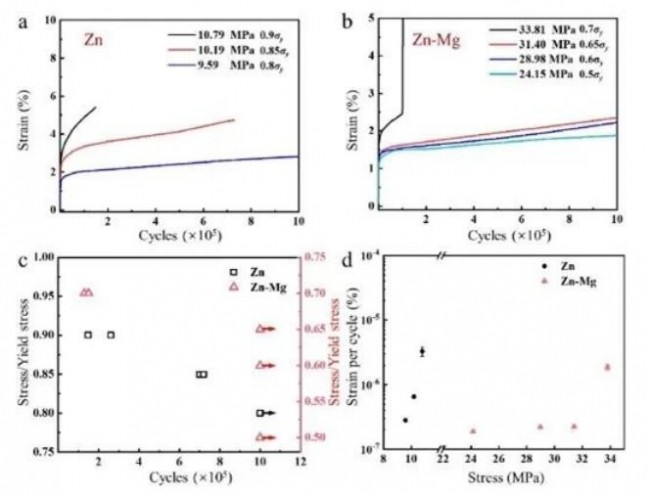 图2 LPBF Zn和Zn-Mg支架在不同载荷下的腐蚀疲劳性能:(a, b) Zn和Zn-Mg支架的累积应变曲线;(c)应力/屈服应力与循环率的关系;(d)不同应力下每个周期的累积应变。