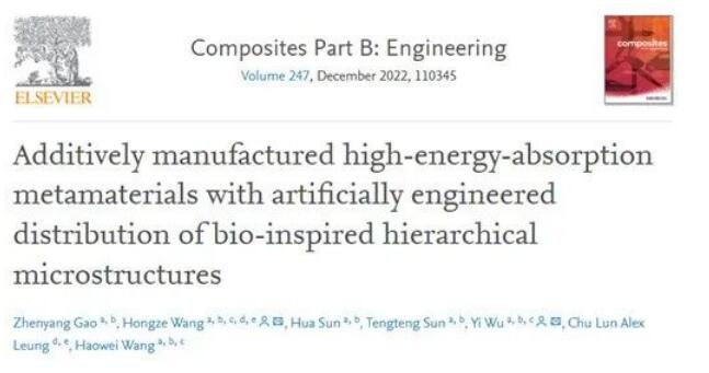 相关研究成果以题目为:“Additively manufactured high-energy-absorption metamaterials with artificial engineered distribution of bio-inspired hierarchical microstructures”的论文在复合材料领域高水平期刊Composites Part B: Engineering上发表,博士生高振洋为第一作者,王洪泽副教授和吴一副研究员为共同通讯作者,共同作者还包括孙华助理研究员,博士生孙腾腾,英国伦敦大学学院Chu Lun Alex Leung教授和王浩伟讲席教授。