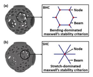 图3. 基于蜂窝设计不同失效模式的多层级仿生元胞:(a)bending-dominated honeycomb (BHC), (b)stretch-dominated honeycomb (SHC)