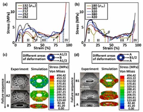研究者通过实验与模拟结合的方式,研究了不同拓扑密度下SHC与BHC元胞力学性能实验观测(图5)这些元胞在压缩载荷下的变形过程、应力分布、与力学曲线。其结果标明不同拓扑密度的元胞具有不同的失效模式,其中SHC元胞相比于BHC具有强度更高,塑性较低等特点。并且,随着微结构密度的变化,元胞力学性能具有一定的规律性。