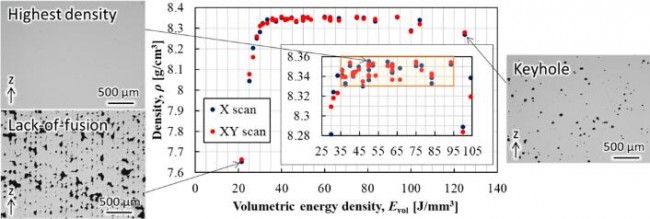 图 2. 体积能量密度与样品密度关系示意图 (Evol 小于 35 J/mm3 时,材料密度迅速下降并出现未融合缺陷;当 Evol 超过 95 J/mm3 时,材料密度下降缓慢并出现气体孔隙)。