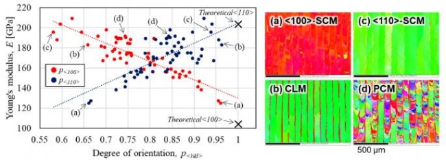 通过杨氏模量测量,作者团队还研究了采用 LPBF 工艺获得的晶体结构对样品力学性能的影响,晶体结构的取向度与测得的杨氏模量之间的关系如图 4 所示。