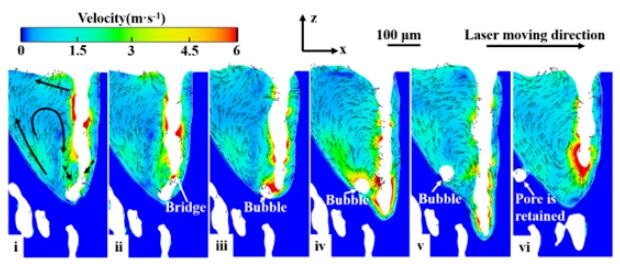 研究人员结合3D流线以及示意图揭示了KP-pore形成机制(图4),概括为:匙孔壁上凸起的形成造成波动;匙孔底部被凝固界面捕获;匙孔穿透熔池导致与固态基体直接作用;最终在材料内部留下气孔。