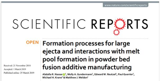 相关研究以“Formation processes for large ejecta and interactions with melt pool formation in powder bed fusion additive manufacturing”为题发表在《Scientific Reports》。