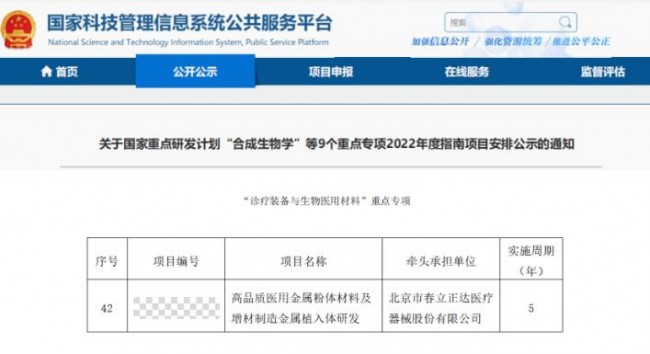 近日,科技部发布了国家重点研发计划“十四五”重点专项2022年项目评审结果。由北京市春立正达医疗器械股份有限公司(简称:春立医疗)牵头申报的“高品质医用金属粉体材料及增材制造金属植入体研发”项目获立项支持。目前,项目任务书已经下发,首笔国拨经费已经下拨。这是春立医疗继“十三五”之后再次获批国家重点研发计划项目。