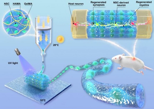 近日,清华大学附属北京清华长庚医院神经外科王贵怀团队和清华大学材料学院王秀梅团队基于生物3D打印技术,成功制备了一类有生命的类神经纤维,该纤维由类似于天然细胞外基质的水凝胶包裹着高密度的神经干细胞组成,纤维定向排列组装为精准适配脊髓损伤区域大小的微型类组织,可作为移植物进行修复治疗(图1)。