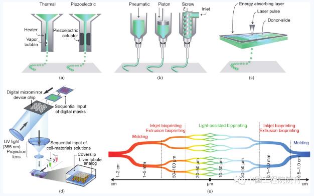 图2 具有代表性的3D生物打印方法。(a)喷墨生物打印法示意图;(b)挤出生物打印法原理图;(c)激光辅助生物打印法原理图。经Wiley许可,转载自参考文献,©2013。(d)光固化生物打印法示意图。经Xuanyi Ma等许可,转载自参考文献。(e)血管的层次结构和当前的生物打印技术示意图,这些技术已被用于制造各种不同的血管。经Elsevier许可,转载自参考文献,©2019