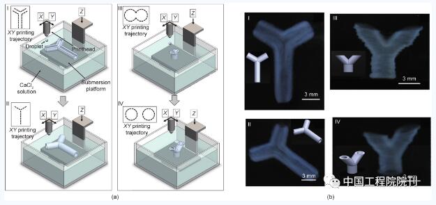 图4 小口径血管的喷墨生物打印。(a)图示为水平(I、II)和垂直(III、IV)分叉管状结构的喷墨生物打印,其中有/无细胞的海藻酸钠液滴(浓度1%),沉积在平台上,然后与CaCl2溶液交联;(b)水平打印产生的海藻酸分叉管的顶视图(I)和全局视图(II),以及垂直打印产生的海藻酸分叉管的正视图(III)和全局视图(IV)。经Wiley许可,转载自参考文献,©2015