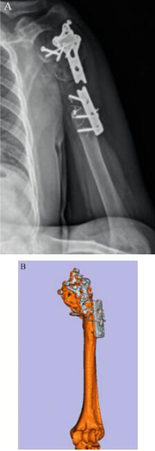 患者,女性,11年前多发骨折行内固定术,术后持续肩关节活动受限,复查过程中见骨质愈合欠佳,内固定物折断,过程中未予以特殊处置。现以“内固定物折断,左侧肱骨近端骨不连”收入我科。右肩关节活动度良好。左肩关节活动度明显受限,屈曲在0°和10°之间,后伸在0°和5°之间,外展在0°和5°之间。双肘关节活动度良好。