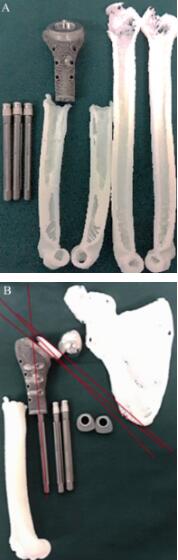 图7 打印的假体和模型匹配验证A.假体与剖开模型匹配验证(主要看髓腔);B.假体与完整模型匹配验证(主要看形态)。