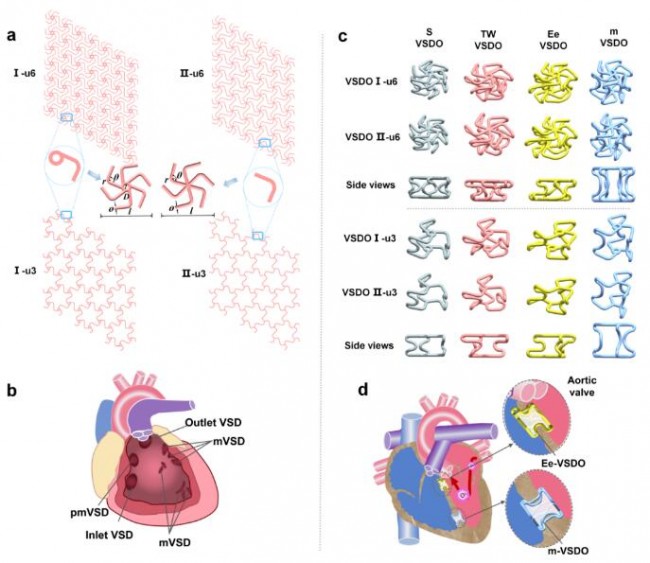 图3(a)仿生波浪形网络和代表单元的几何参数。(b)VSD的分类和位置。(c)设计的VSD封堵器的3D模型。(d)偏心VSD封堵器(Ee VSDO)和肌部VSD封堵器(m-VSDO)封堵VSD示意图。