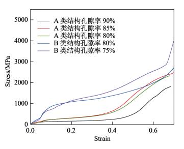 研究结果表明,A类结构孔隙率为90%的多孔骨骼支架弹性模量为7.5 GPa,抗压强度为11.62 MPa,与人体松质骨相吻合;B类结构孔隙率为80%的多孔骨骼支架弹性模量为18.9 GPa,抗压强度为127.01 MPa,与皮质骨相吻合。