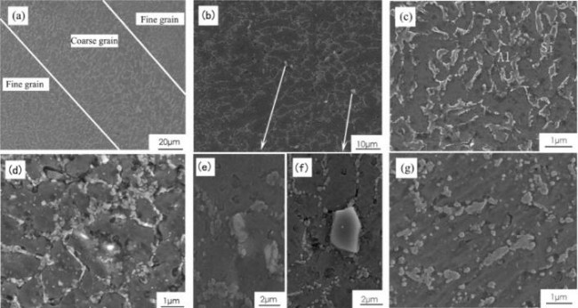 图6 SLM成形试样的SEM形貌(a) ZL114A铝合金(b) 2%TiB2/ZL114A复合材料,低倍(c) 2%TiB2/ZL114A复合材料,高倍(d) 1TiB2/ZL114A复合材料,高倍(e)团聚的TiB2颗粒(f)团聚长大的TiB2颗粒(g)1TiB2/ZL114A复合材料。