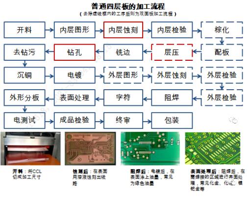 如下是一个PCB四层板的基本加工流程步,根据加工工艺不同,总流程数在23~25步之间,而双面板的流程步,则是去除如下虚线框的流程,大致在17步左右。