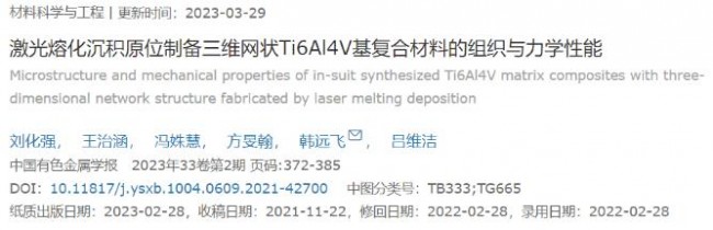 相关研究论文以题为《激光熔化沉积原位制备三维网状Ti6Al4V基复合材料的组织与力学性能》发表在《中国有色金属学报》。本期谷.专栏,将分享该文的研究背景、亮点、研究结果与结论。
