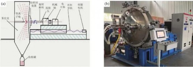 图2 等离子旋转电极雾化制粉原理示意图(a)及等离子旋转电极雾化制粉设备实物图(b)