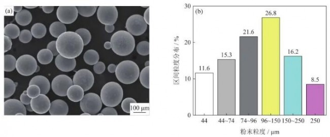 图3 等离子旋转电极雾化法制备Ti185合金粉末显微形貌(a)与粒度分布(b)