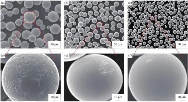图5 不同粒度Ti185粉末表面形貌:(a)150~250 μm;(b)74~96 μm;(c)44 μm;(d)、(e)、(f)分别为(a)、(b)、(c)局部放大
