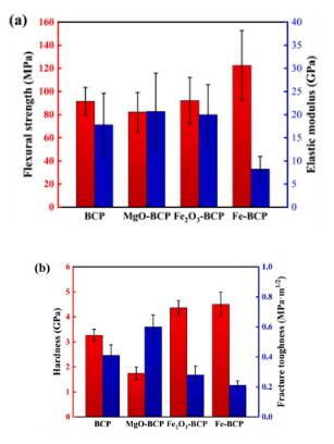 图3. BCP、MgO-BCP、Fe2O3-BCP、Fe-BCP陶瓷的(a)抗弯强度和弹性模量、(b)硬度和断裂韧性。