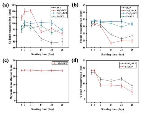 图4. BCP、MgO-BCP、Fe2O3-BCP、Fe-BCP在模拟体液中(a) Ca、(b) P、(c) Mg、(d) Fe离子释放曲线。