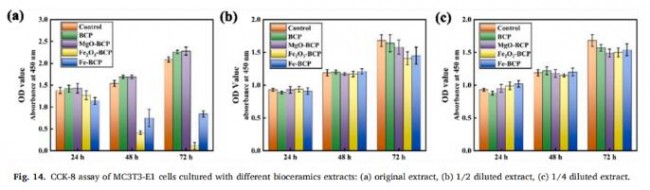 图5. 不同浓度生物陶瓷提取液对MC3T3-E1细胞增殖行为影响。(a) 原始提取液,(b) 1/2稀释提取液,(c) 1/4稀释提取液。