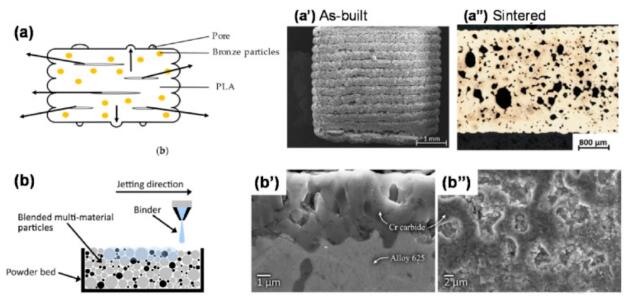 金属增强聚合物挤出和多材料粘结剂喷射3D打印的图示,分别带有界面和孔隙率