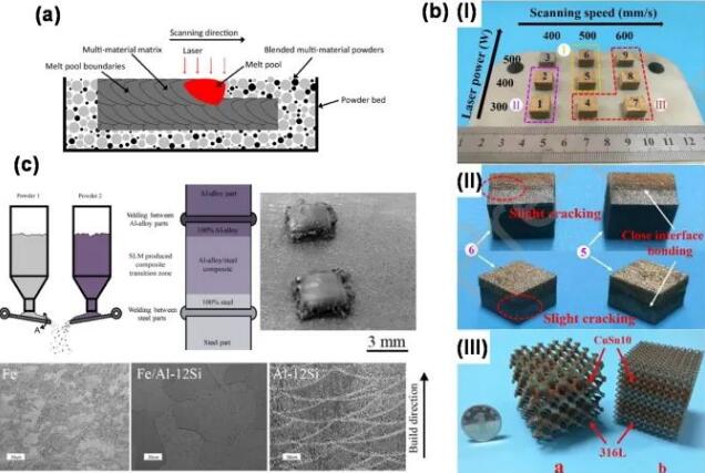 图 . (a) LPBF 激光选区熔融3D打印工艺加工的预混异种粉末的图示,(b) LPBF 激光选区熔融3D打印工艺加工的316L/CuSn10 多材料的工艺参数优化在最佳工艺条件下实现多材料晶格制造并成功防止界面开裂,(c) LPBF 激光选区熔融3D打印工艺加工的 Fe/Al-12Si 多材料加工表现出尺寸不准确,但结合强度足够高。