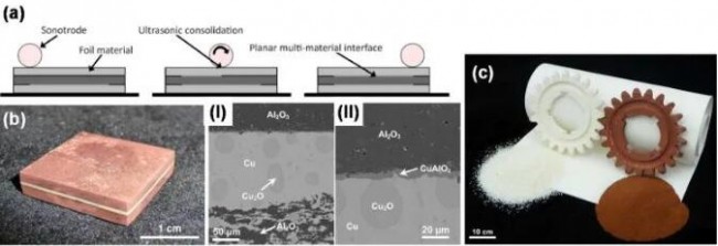 图 7. (a) 多材料片材层压工艺的图示,(b) 通过片材层压工艺成功制造 Al2O3/Cu-O 夹层结构,以及 (c) 示范性齿轮形状制造.