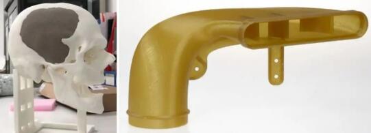 选区激光烧结3D打印的PEEK颅骨修复模型(左)和FDM打印的PEKK通风管道模型(右)
