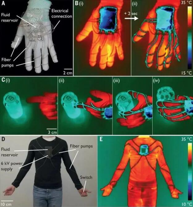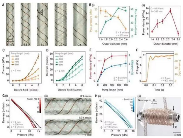 研究团队研制的纤维流体泵由连续的螺旋电极嵌入薄弹性管壁中组成,并通过电荷注入电流电动力学静默地产生压力。每米纤维可以产生100千帕斯卡的压力,流量可达每分钟55毫升,相当于每千克15瓦特的功率密度。设计自由度的优点是相当大的,研究团队通过可穿戴触觉、机械活性织物和热调节织物的演示来说明这一点。