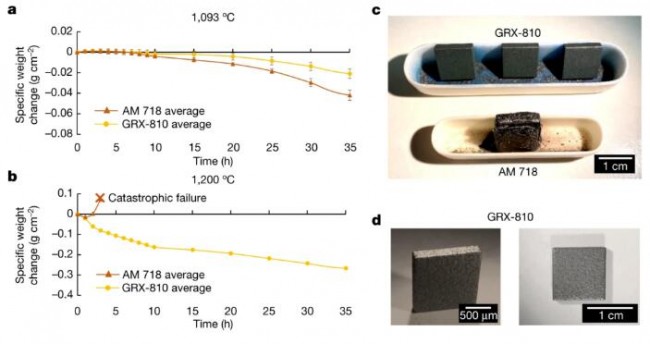 对GRX-810和Superalloy 718 进行的循环氧化测试的结果显示,在 1,093°C 高温下的暴露期间,显示的结果表明,GRX-810 在 1,093°C 时的氧化耐久性优于 AM增材制造高温合金 718,并且在 1,200°C 时明显更好。