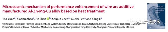 近期,北京工业大学材料与制造学部和上海交通大学机械与动力工程学院袁涛等人在焊接领域知名期刊“Science and Technology of Welding and Joining”上,共同发表了一篇题为《基于热处理的电弧增材制造Al-Zn-Mg-Cu合金性能增强的微观机理》的文章,研究针对Al-Zn-Mg-Cu合金电弧增材制备镀层力学性能差的问题,采用热处理的方法进行了有效改善。