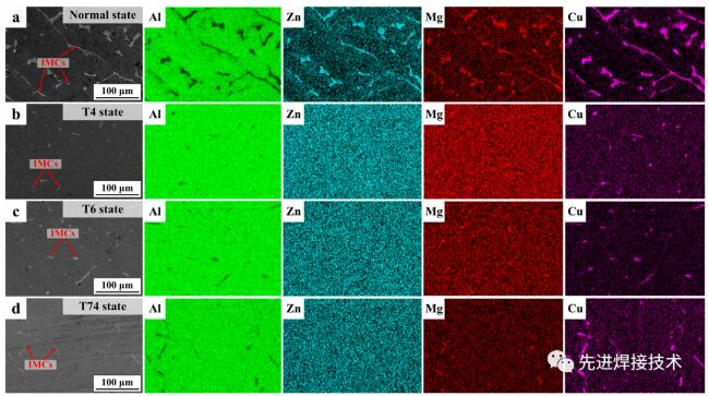 图3-不同条件下Al-Zn-Mg-Cu合金WAAM沉积的EBSD结果。(a) 正常状态,(b) T4状态,(c) T6状态,(d) T74状态