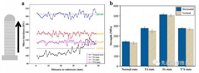 图7-不同热处理条件下沉积件的显微硬度分布及拉伸性能。(a) 垂直显微硬度分布; (b) 水平和垂直拉伸强度