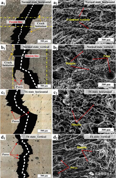 图8-不同热处理下拉伸试样断裂特征的LCM和SEM照片。(a1)和(a2)为正常状态水平裂缝,(b1)和(b2)为正常状态垂直裂缝,(c1)和(c2)为T6状态水平裂缝,(d1)和(d2)为T6状态垂直裂缝