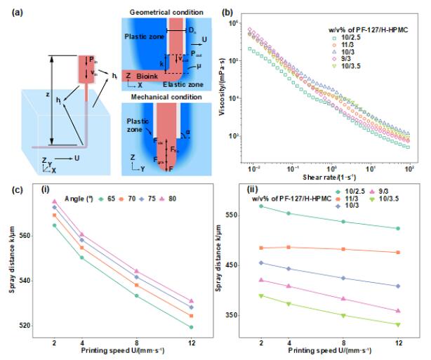 研究团队首先研究了生物墨水的沉积过程,从墨水离开喷嘴到打印介质与其周围嵌入介质之间的相对速度为零的稳定状态。建立了一个简化模型,假设如下:a)生物墨水和嵌入介质都是不可压缩的。b)沉积过程是绝热过程。c)在打印过程中,嵌入介质的粘度随着移动喷嘴周围剪切速率梯度引起的梯度而变化。d)生物墨水在被挤出后的粘度是恒定的,并且在分析的生物墨水中没有速度梯度。对于特定嵌入介质中的恒定打印速度,可以估计喷嘴周围的剪切速率场和粘度场。因此,在已知的挤出压力下,可以针对选定的微质量单位来分析生物墨水在嵌入介质中行进的距离。通过倾斜喷嘴,可以控制垂直和水平方向上的位移分量,进而实现同步打印过程中相邻微丝可控的横向粘结。