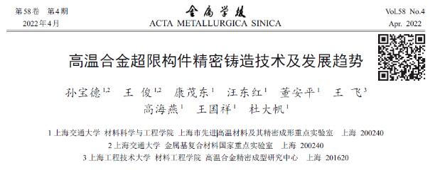 孙宝德, 王俊, 康茂东, 汪东红, 董安平, 王飞, 高海燕, 王国祥, 杜大帆. 高温合金超限构件精密铸造技术及发展趋势[J]. 金属学报, 2022, 58(4): 412-427.
