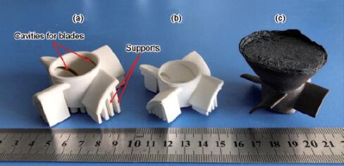 (a) as-printed green shell (b) sintered shell (c) impeller casting