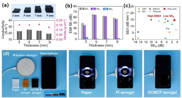 图5. (a) 具有3、5、7和9 mm厚度的GCMCP气凝胶框架的光学照片,以及电导率和密度;(b) 不同厚度GCMCP气凝胶框架的SET、SEA和SER值;(c) 与文献报道的电磁屏蔽材料的性能对比;(d) 纸张、PI气凝胶框架和GCMCP气凝胶框架对无线充电器的电磁屏蔽能力。