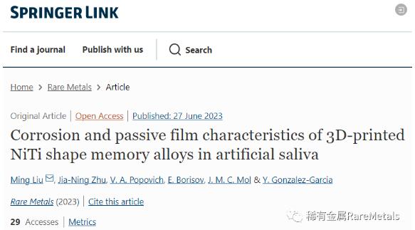 日前,西安交通大学材料科学与工程学院的刘明副教授与荷兰代尔夫特理工大学Arjan Mol教授课题组在Rare Metals上发表了题为“Corrosion and passive film characteristics of 3D-printed NiTi shape memory alloys in artificial saliva”的研究文章。研究了采用L-PBF不同工艺参数下制备的3种NiTi形状记忆合金耐蚀性和钝化膜特性。采用电化学技术对三种L-PBF NiTi在人工唾液中的腐蚀与钝化膜性能进行了系统研究,以确定不同L-PBF制造工艺条件下的钝化膜性能,并结合表面分析进一步确定钝化膜耐蚀性差异。