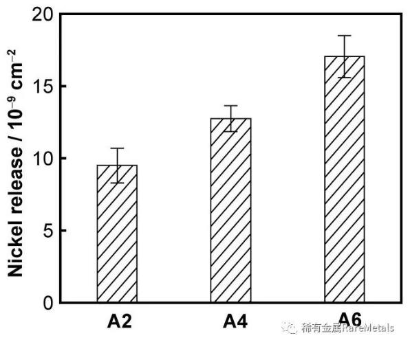 图4 L-PBF NiTi在人工唾液中浸泡168 h的Ni离子释放速率A2 (9.5 ppb/cm2)、A4 (12.7 ppb/cm2)、A6 (60 17.1 ppb/cm2)