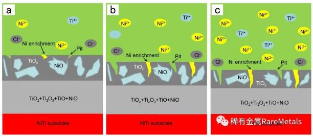 图5 L-PBF NiTi在人工唾液中的钝化膜和Ni离子释放示意图,a A2 (56 J/mm3), b A4 (87 J/mm3), c A6 (60 J/mm3)