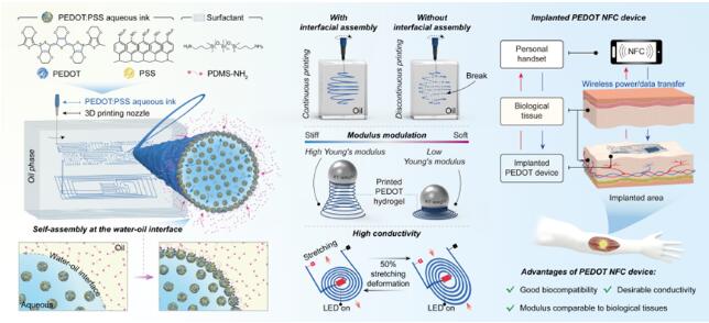 图1. 液-液3D打印技术制备PEDOT:PSS导电水凝胶的机理、过程与产品特性示意图