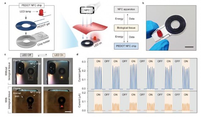 打印出的PEDOT:PSS水凝胶制成的NFC芯片可以实现在有生物皮肤阻隔的条件下,与手机端进行无线信号传输以及电信号的转换,使与之相连的LED灯泡以2 Hz的周期进行闪烁。